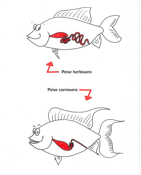 Quando a dieta do peixe se volta para microanimais e grande parcela de vegetais, por exemplo, é preferível ter um longo intestino do que um estômago. Lembro que é no intestino que são retiradas as qualidades do alimento e já que é mais demorado retirar algo do material vegetal, um caminho mais longo e lento ajuda em tal absorção de nutrientes. Assim, em termos de morfologia interna, peixes herbívoros possuem um longo (se esticado dá entre 2 e 5 vezes o comprimento do corpo) e sinuoso intestino, ligado diretamente ao esôfago, enquanto os carnívoros dispõem de estruturas menores e sem muitas curvas.