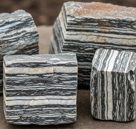 Gnaisse. Uma metamórfica muito comum, caracterizada por bandas alternadas de minerais, dando aquele aspecto rajado a ela, muito bonito. Costumam conter quartzo e feldspato, o que as torna pouco ativas na água.