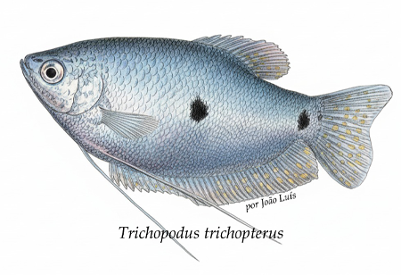 • Tricogaster Azul (Trichopodus trichopterus): O mais comum. É fácil de reconhecer pelas duas manchas pretas no corpo.