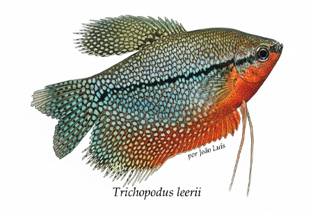 Também encontrado com o nome de Tricogaster pérola, por ter seu corpo coberto por pequenos pontos brancos que lembram pérolas, este lindo peixe é extremamente pacífico, chegando a cerca de 12 cm.